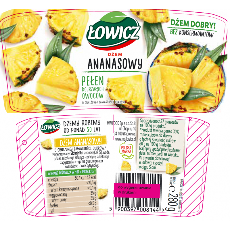 Łowicz Dżem ananasowy o obniżonej zawartości cukrów 280 g